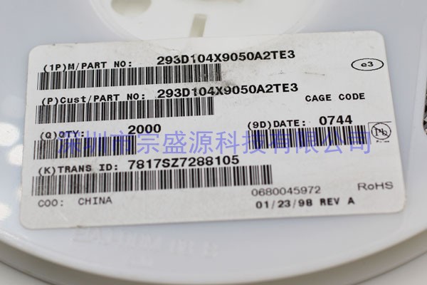 VISHAY鉭電容 3216 50V 0.1UF 293D104X9050A2TE3